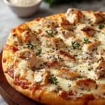 This Roasted Garlic White Chicken Pizza features a flavorful creamy garlic sauce made from roasted garlic, butter, and cheeses, topped with tender shredded chicken, red onions, and melted mozzarella on a golden, crispy pizza crust. With fresh herbs to finish, this pizza delivers a perfect balance of rich and savory flavors, suitable for a satisfying homemade meal.