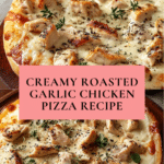 Keywords: roasted garlic pizza, white chicken pizza, garlic sauce pizza, homemade pizza recipe, creamy garlic sauce, baked pizza, mozzarella chicken pizza