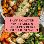 Keywords: roasted vegetable bowl, chickpea bowl, tahini dressing, vegan bowl, healthy roasted vegetables, plant-based protein, Mediterranean recipe