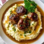 PrintSalisbury Steak Meatballs with Garlic Herb Mashed Potatoes Recipe