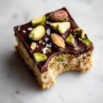 - Coat Bars with Chocolate: Pour the melted chocolate over the pressed mixture in the pan, tilting the pan to evenly cover the surface. Sprinkle 2 tablespoons of chopped pistachios on top for extra texture and flavor.