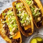 These Smash Burger Tacos combine the delicious flavors of a classic smash burger with the convenience and fun of a taco. Ground beef is spread thinly over warm flour tortillas and cooked until crispy and golden, then topped with melted American cheese, crisp lettuce, diced onions, and tangy dill pickles for a satisfying meal that’s perfect for lunch or dinner.