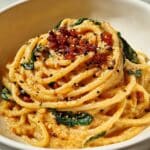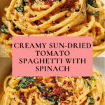 A delightful and creamy pasta dish featuring al dente spaghetti tossed with fresh spinach and sun-dried tomatoes in a rich sun-dried tomato cream sauce, flavored with garlic, Parmesan cheese, and a hint of red pepper flakes. This easy-to-make meal is perfect for a satisfying weeknight dinner or special occasion.
