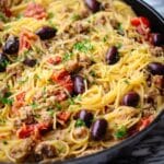 This Spaghetti Squash Nonna with Italian Sausage is a delightful, lighter alternative to traditional pasta dishes. Packed with flavorful sausage, roasted tomatoes, olives, and garlic, it offers a satisfying, wholesome meal that’s easy to prepare and full of Mediterranean charm.
