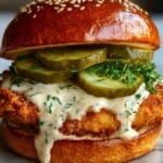 8. Assemble the Sandwiches: Spread a generous amount of the creamy sauce on the bottom half of each toasted bun. Layer on the fried chicken breast, two dill pickle slices, a leaf of lettuce, and tomato slices if desired. Top with the other half of the bun.