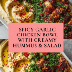 Keywords: Spicy garlic chicken bowl, hummus bowl, Mediterranean chicken recipe, cucumber salad, easy dinner bowl, healthy chicken recipe