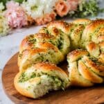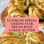 This Spring Greens Star Bread is a visually stunning and flavorful yeast bread filled with a vibrant mix of baby arugula, fresh basil, garlic, and creamy Boursin cheese, layered between tender layers of soft dough twisted to form a beautiful star shape. Brushed with garlic butter after baking, it’s perfect as a centerpiece for gatherings or a delicious appetizer to share.