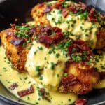 Two fried chicken breasts with a dark golden-brown crispy crust are placed side by side in a shallow black pan. Each piece is generously covered with a smooth, creamy beige sauce that drips down the sides. The sauce is topped with small bright green chopped chives and crispy reddish-brown bacon bits scattered on each chicken breast. The surface beneath the pan is a white marbled texture. photo taken with an iphone --ar 4:5 --v 7