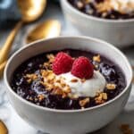 Thai Black Sticky Rice Pudding is a comforting and fragrant dessert that beautifully combines the nutty flavor of black glutinous rice with creamy coconut milk. It’s a traditional treat enjoyed warm and often garnished with fresh mango or coconut flakes for an added tropical touch.