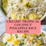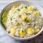 Keywords: coconut rice, pineapple rice, tropical rice, jasmine rice recipe, coconut milk rice, toasted coconut, lime rice